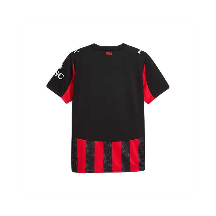 As icônicas listras em vermelho e preto aparecem renovadas, mantendo a essência rossonera enquanto incorporam detalhes modernos que valorizam ainda mais o visual do uniforme.