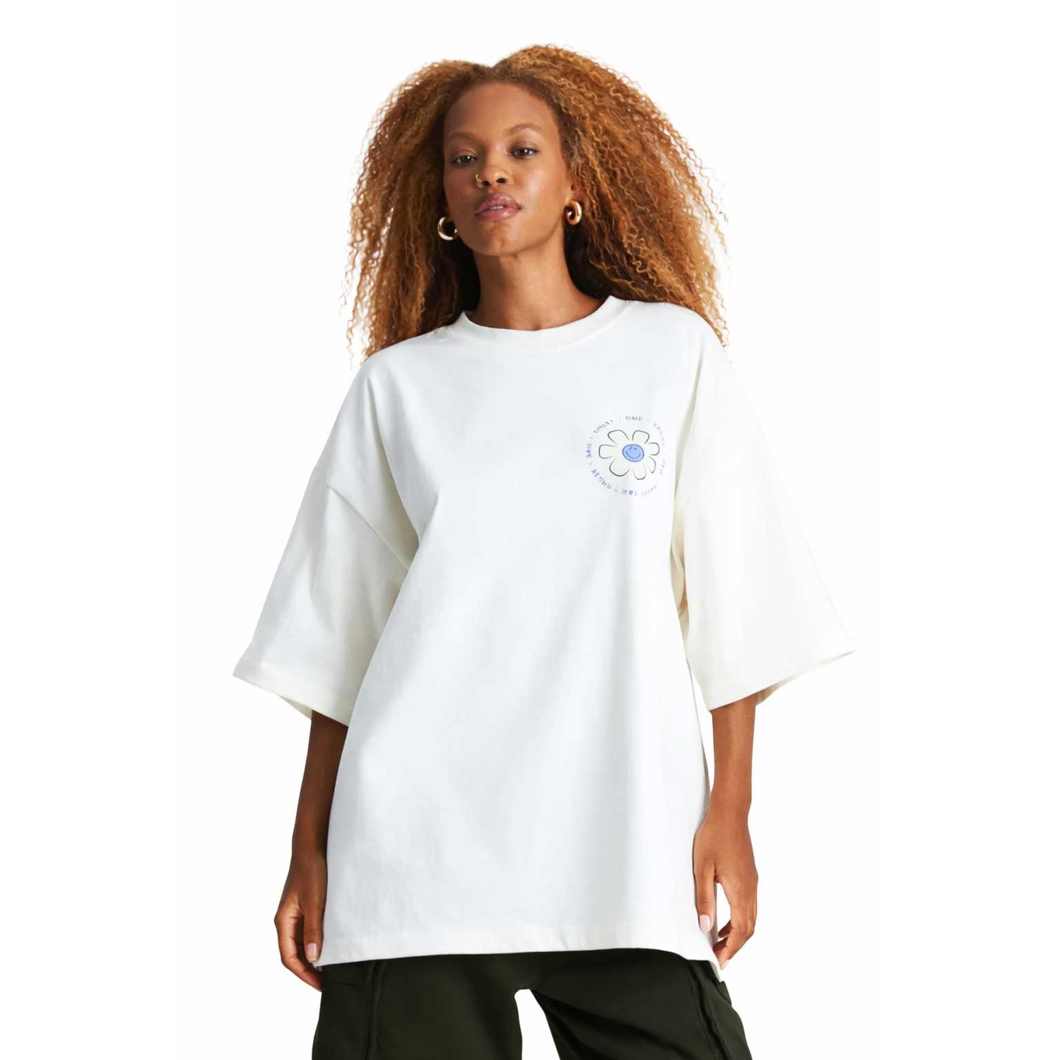 A collab une a icônica flor com o smiley centralizado nas costas, criando uma estampa impactante que transmite leveza, atitude e energia positiva.