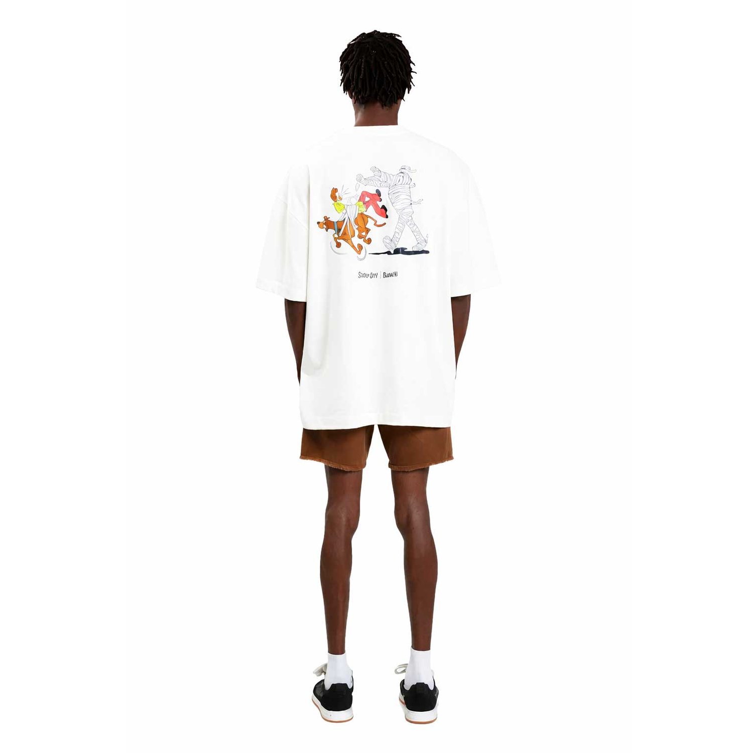 Na parte frontal, a estampa do Scooby-Doo em versão temática “Tied” ganha destaque com cores vibrantes e lettering icônico, trazendo um toque nostálgico e irreverente. Já nas costas, a arte complementa a proposta criativa da colaboração, reforçando a identidade urbana da Baw com o universo clássico do desenho.