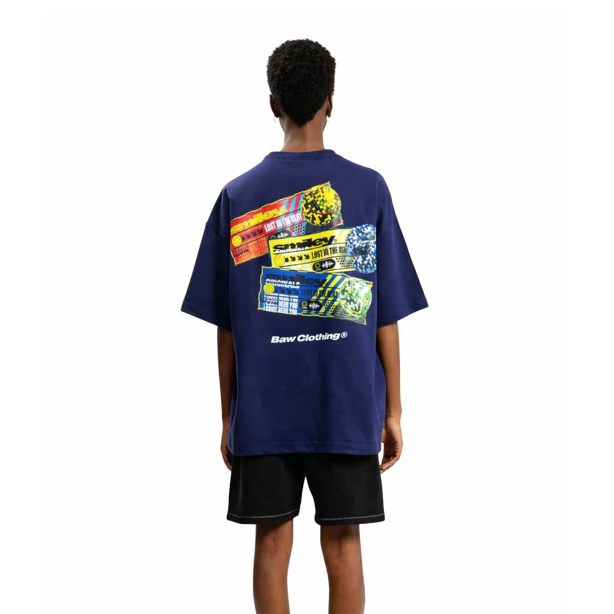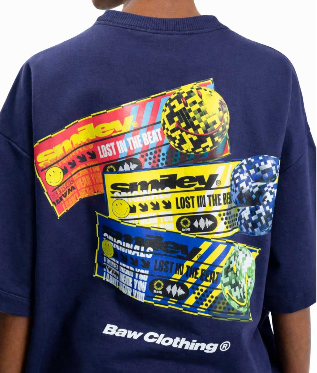 Na parte frontal, a estampa “Smiley” aparece com efeito gráfico diferenciado, acompanhada da assinatura Baw Clothing®, criando uma identidade forte e contemporânea. Já nas costas, o destaque fica por conta da arte inspirada em tickets e elementos gráficos vibrantes, que misturam cores e referências urbanas em uma composição dinâmica.
