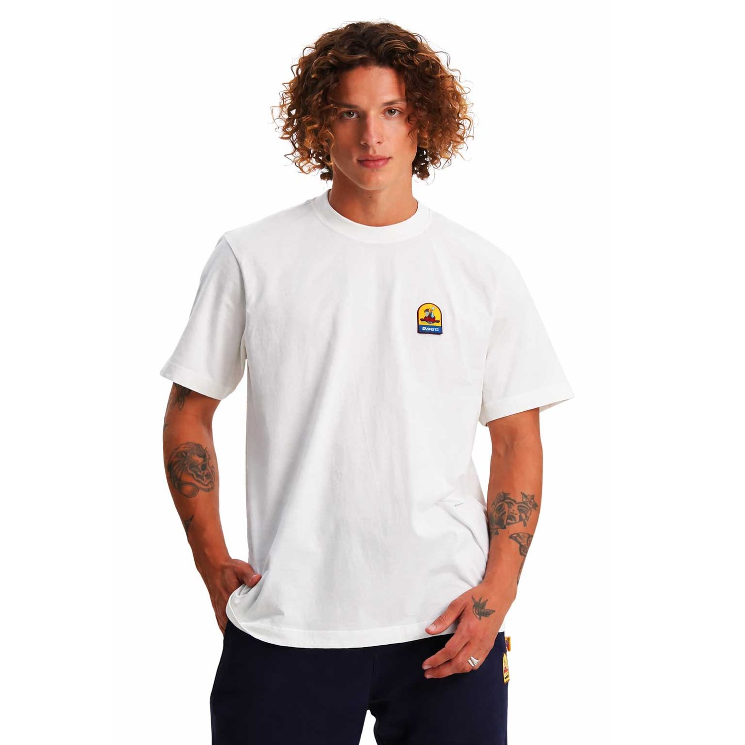 Em cor off white, ela aposta em um visual clean na parte frontal, com aplicação discreta no peito, criando contraste com a estampa marcante nas costas.