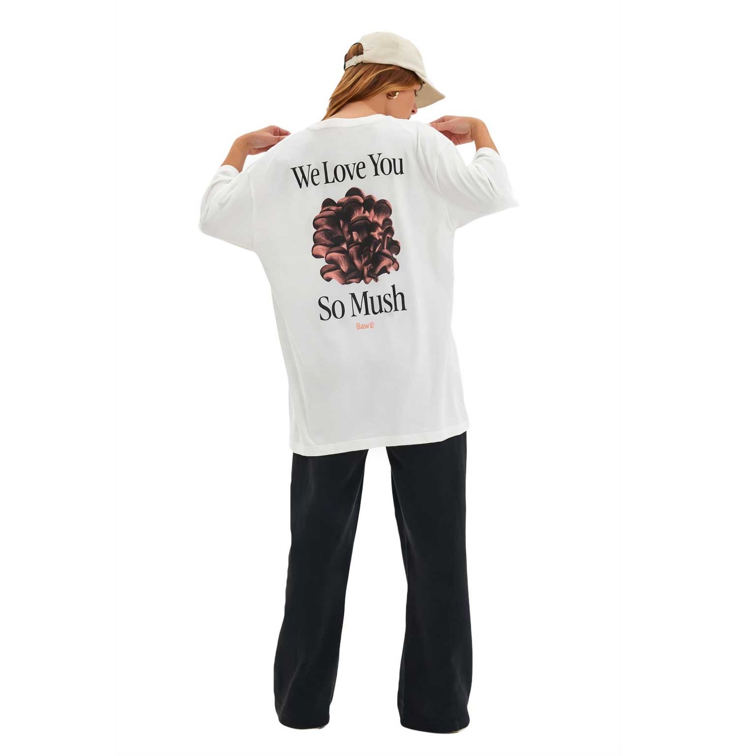 Na parte frontal, o logo minimalista mantém a proposta clean. Já nas costas, a estampa marcante “We Love You So Mush” transforma a camiseta em destaque instantâneo.