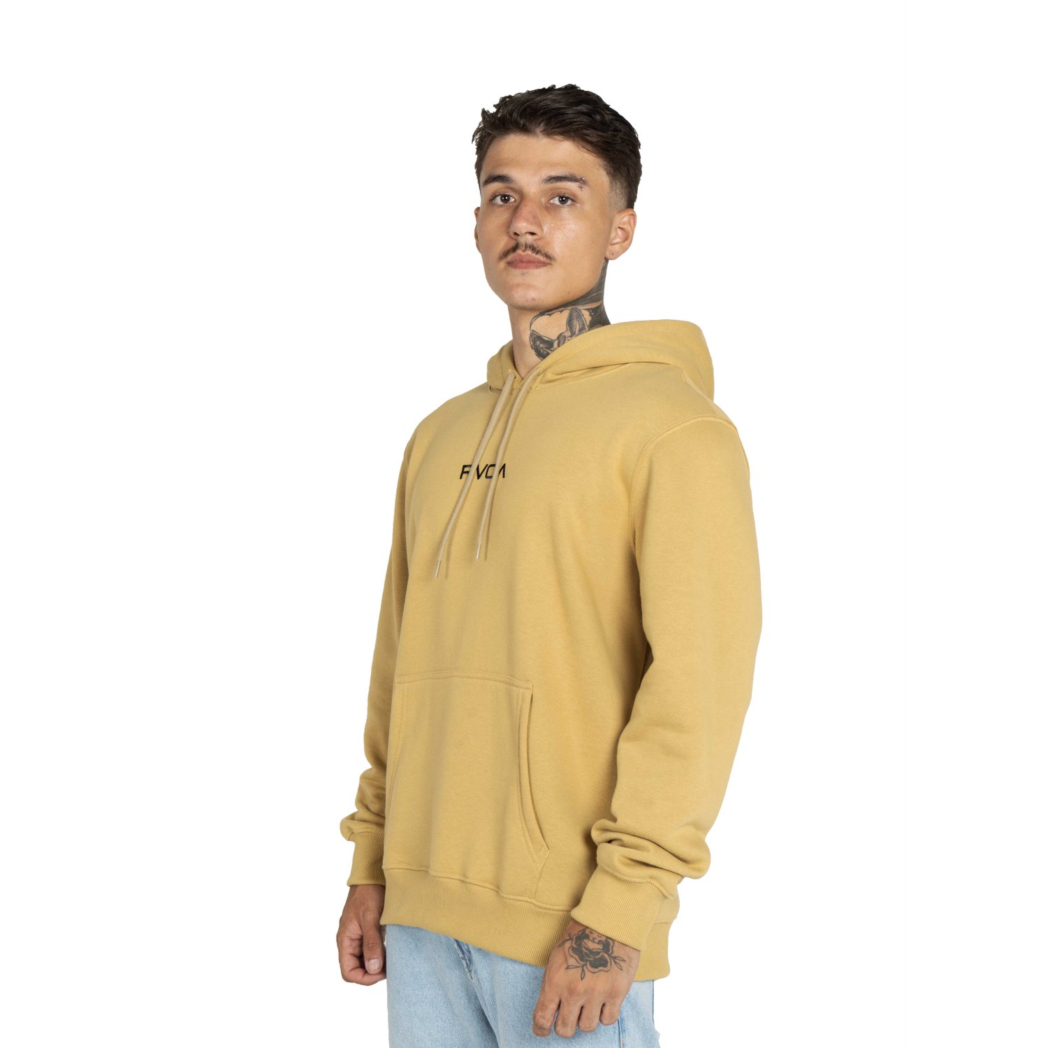 O bolso frontal estilo canguru dá aquele espaço extra para as mãos ou pequenos objetos, enquanto a estampa minimalista com o logo RVCA no peito deixa o look limpo, moderno e fácil de combinar com outras peças.