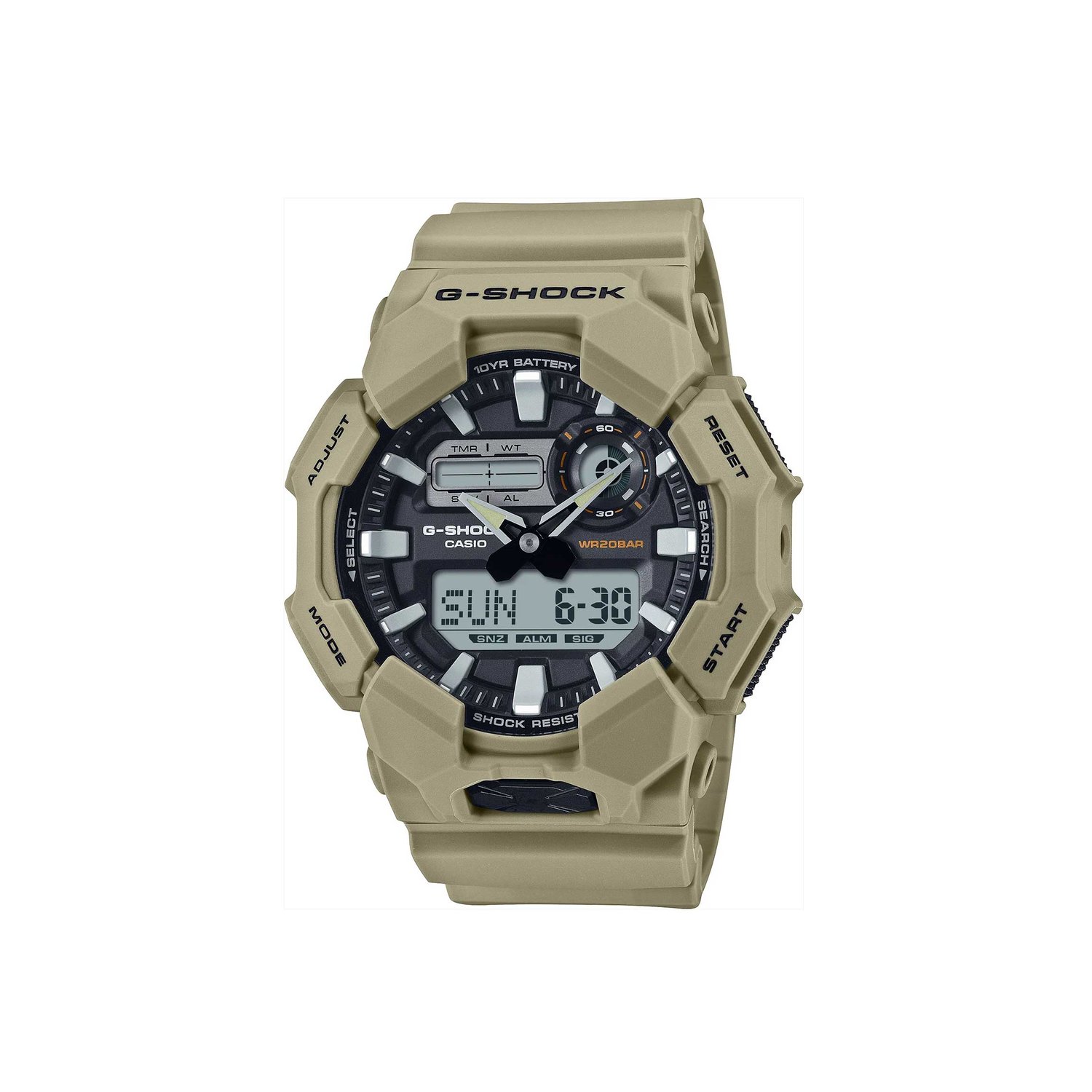 O relógio G-Shock GA-010-5ADR apresenta design imponente com caixa e pulseira em resina de alta resistência, garantindo durabilidade para o uso diário, atividades outdoor e rotinas mais intensas. Seu visual versátil combina facilmente com produções urbanas e esportivas.