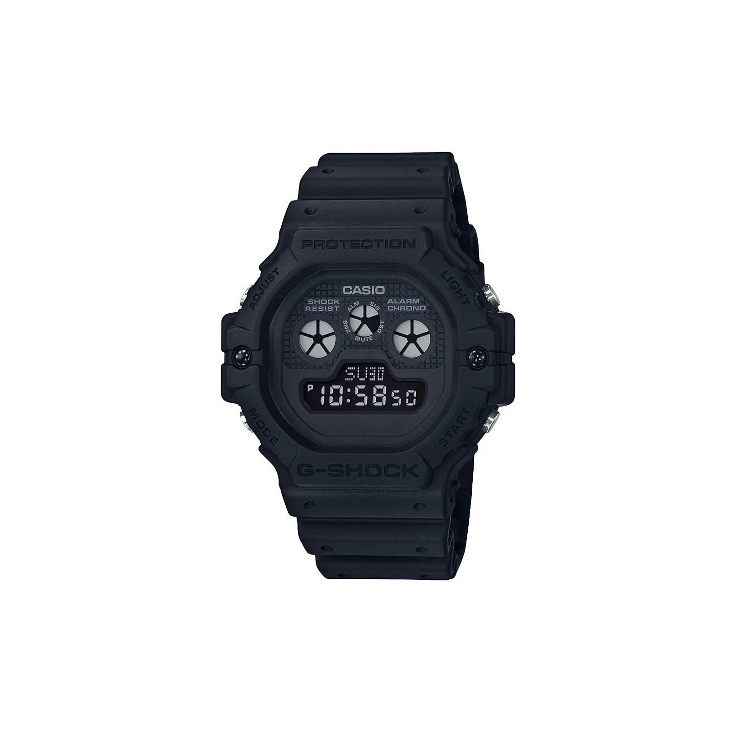 O G-Shock DW-5900BB se destaca pelo visual all black e pelo icônico mostrador com três visores circulares, um design clássico que remete aos primeiros modelos da marca, agora reinterpretado com um toque moderno e urbano. É um relógio que entrega presença sem exageros, perfeito para quem curte um estilo mais clean e imponente.